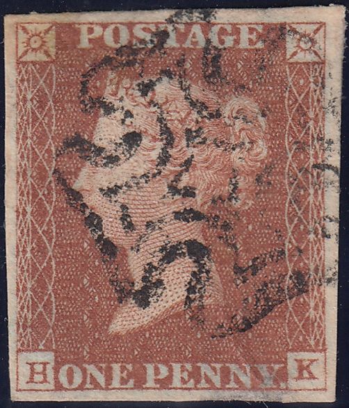 PL.31 (SG8)(HK) MISSING IMPRIMATUR LETTERING. Used 1843 1d pl.31 (SG8) lettered HK, thinned on reverse but four good margins and cancelled fine black Maltese Cross. MISSING IMPRIMATUR LETTERING. (Ref 120256).