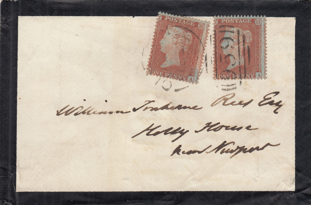 1855 MOURNING ENVELOPE CLIFTON, BRISTOL TO NEWPORT WITH DIE 1 1D PL.203 (SG17) X 2. Fine mourning envelope from Clifton, Bristol to 'William Treherne Rees Esq, Holly House, Near Newport' (Monmouthshire) with Die 1 1d pl. 203 S.C.16 (SG17) x 2 lettered OA and PA tied light strike 'CLIFTON/959' sideways duplex JU 6 1855. Attractive usage. (Ref 141518).