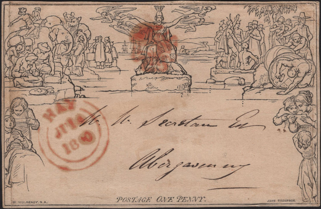 1840 1D MULREADY FRONT HAY ON WYE, BRECON TO ABERGAVENNY. Fine front 1d Mulready from Hay on Wye to Abergavenny, on front fine strike 'HAY' date stamp JU 14 1840 and indistinct strike Hay Maltese cross in red. Very scarce provincial use. (Ref 141699).