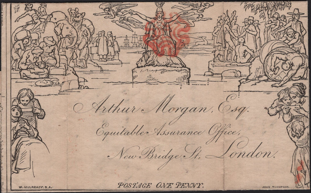1841 1D MULREADY ADVERT 'EQUITABLE ASSURANCE' WITH PRINTED ADDRESS (MA126a) GOOD TO FINE USED DEVONPORT TO LONDON. Good to fine used 1d Mulready wrapper, stereo unknown, from Devonport in Devon to London with attractive printed address in script style to 'Arthur Morgan Esq. Equitable Assurance Office, New Bridge St, London', filing fold affects, cancelled fine strike Maltese cross of Devonport in a pale red shade which Mike Jackson lists as 'Pink/pinkish red'. On reverse 'DEVONPORT' date stamp JA 4 1841 in same shade. On reverse written letter dated 3rd Jan 1841 with health report. Unusual Mulready with nine used examples recorded to date. (Ref 141745).