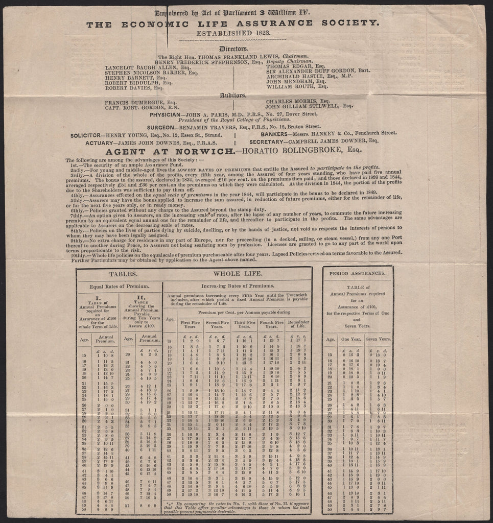 1840 1D MULREADY ADVERT 'THE ECONOMIC LIFE ASSURANCE SOCIETY' (SPEC MA119b) FINE UNUSED. Fine unused 1d Mulready wrapper, stereo A63, filing fold but clean example, within fine printed advert 'THE ECONOMIC LIFE ASSURANCE SOCIETY' (Spec MA119b). At top right Directors are 'EDGAR, GORDAN, HASTIE, MENDHAM, ROUTH' and in centre 'AGENT AT NORWICH.- HORATIO BOLINGBROKE, ESQ'. At lower centre left advantages of the society 10thly. Scarce advert with only three used and three unused examples recorded to date. (Ref 141746).