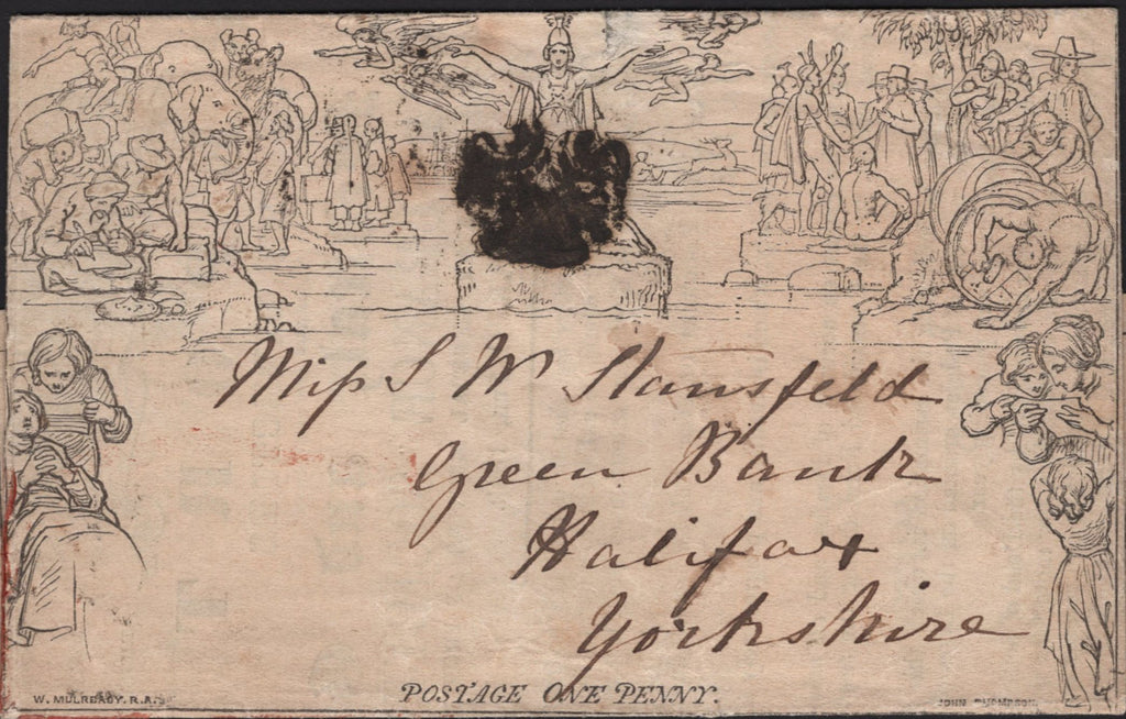 1840 1D MULREADY WRAPPER 'CLERICAL, MEDICAL, AND GENERAL LIFE ASSURANCE SOCIETY' ADVERT 'WILLIAM CRAVEN, SOLICITOR, AGENT, HALIFAX' (SPEC MA113j) GOOD USED LIVERPOOL TO HALIFAX. Good used 1d Mulready wrapper, stereo A239, from Liverpool to 'Mifs S W Stansfeld, Green Bank, Halifax, Yorkshire' with indistinct strike black Maltese cross of Liverpool, on reverse 'LIVERPOOL' date stamp JY 29 1841 and 'HALIFAX' date stamp JY 30 1841. Within fine printed advert 'Clerical, Medical, and General LIFE ASSURANCE SOCIETY' at bottom right 'WILLIAM CRAVEN, SOLICITOR, Agent, Halifax' (Spec MA113j). To date only nine used examples recorded. (Ref 141759).