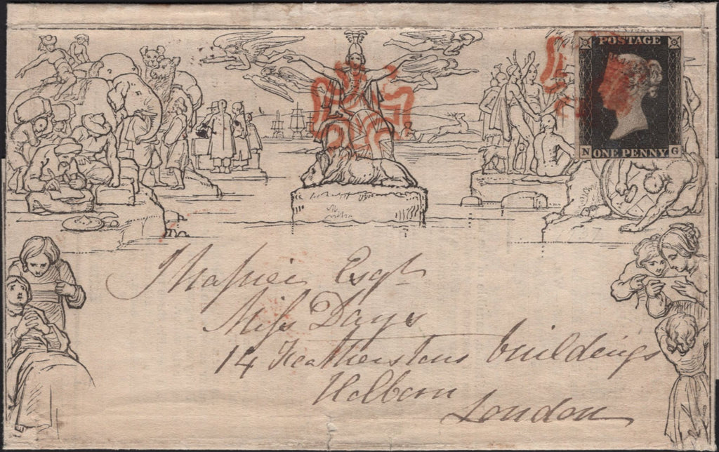 1840 1D MULREADY ADVERT 'CALEDONIAN INSURANCE COMPANY' (MA105a) EDINBURGH TO LONDON UPRATED 1D BLACK PL.3 (SG3)(NG). Fine used 1d Mulready wrapper, stereo A249, slight fault from opening, from Edinburgh to 'J Napier Esq, Mifs Day, 14 Featherstone Buildings, Holborn, London' uprated with fine 1d grey-black pl.3 (SG3) lettered NG, four fine margins and tied fine red-orange Maltese cross of Edinburgh with additional strike on Britannia. On reverse Edinburgh date stamp DEC 21 1840 and London date stamp 23 DE 1840. Within fine printed advert 'CALEDONIAN INSURANCE COMPANY' (Spec MA105a), at bottom middle 'Extracts from the Life Tables'. A fine and rare usage with only one unused and four used examples of this advert recorded to date. (Ref 141765).