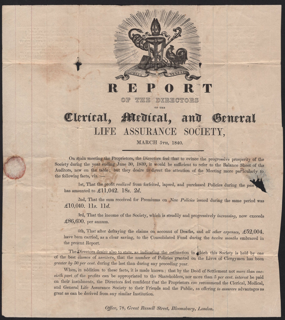 1840 1D MULREADY 'CLERICAL, MEDICAL, AND GENERAL LIFE ASSURANCE SOCIETY' ADVERT (MA106b) GOOD USED LONDON TO HONITON, DEVON. Good used 1d Mulready wrapper, stereo A64, slight faults to corners, slight soiling and small part missing from opening, London to 'Mr. Geo. Turner, Honiton, Devon' cancelled very fine strike red Maltese cross of London and on reverse London date stamp NO 19 1840. Within fine printed advert 'Clerical, Medical, and General LIFE ASSURANCE SOCIETY' dated March 5th 1840 and bottom middle 'Office, 78, Great Russell Street, Bloomsbury, London' (Spec MA106b). Imperfections as described but one of only two used examples recorded to date. (Ref 141766).
