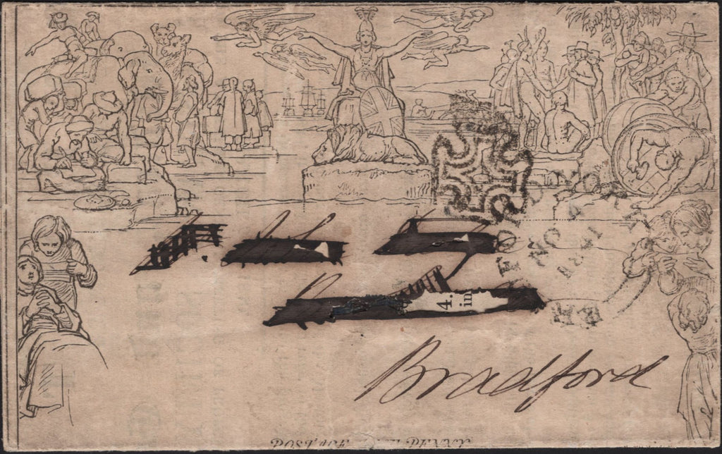 1841 1D MULREADY ADVERT 'CLERICAL, MEDICAL AND GENERAL LIFE ASSURANCE SOCIETY' USED HALIFAX TO BRADFORD WITH 'WILLIAM CRAVEN, SOLICITOR, AGENT, HALIFAX' AT LOWER RIGHT (MA113j). Used 1d Mulready wrapper, stereo A17, from Halifax to Bradford (Yorks) with fine to very fine strike Halifax Maltese cross clear of Britannia and on front 'BRADFORD-YORKS' date stamp NO 4 1841, on reverse 'HALIFAX' date stamp NO 3 1841. Wrapper some soiling and part address missing where crossed through/ink acidity. Within good printed advert 'Clerical, Medical and General LIFE ASSURANCE SOCIETY' dated March 5th 1840, at bottom right 'WILLIAM CRAVEN, SOLICITOR, Agent, HALIFAX' (MA113j). Faults as described but only nine used examples recorded to date. (Ref 141771).