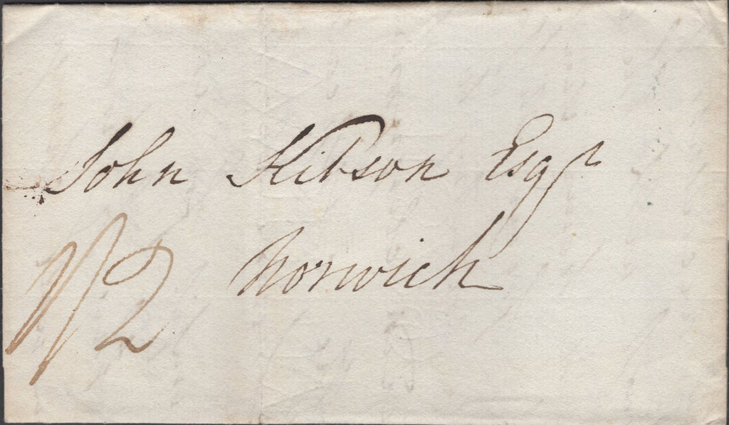 1830 MAIL HOCKWOLD HALL, NORFOLK TO NORWICH WITH 'BRANDON' HAND STAMP (SK51). Fine letter from Hockwold Hall dated Dec 8 1830 to 'John Kitson Esq, Norwich', charged '1/2' and on reverse fine to very fine strike 'BRANDON' straight line hand stamp in dull blue, latest recorded usage according to Tom Slemons. (Ref 137889).
