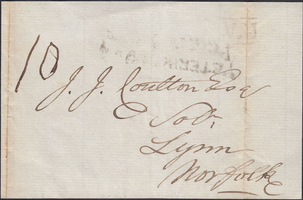 CIRCA 1828 MAIL PETERBOROUGH TO KING'S LYNN WITH 'PETERBOROUGH/PENNY POST' HAND STAMP (NN196). Large part front Peterborough to 'J. J. Coulton Esq., Solr. Lynn Norfolk', charged '10' and on front light strike 'PETERBOROUGH/Penny Post' hand stamp in black (NN196) and light strike boxed 'No.3' receiving house hand stamp of Crowland. (Ref 125099).