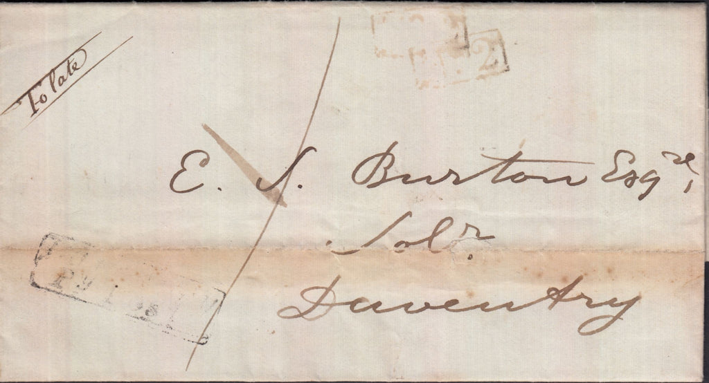 1835 MAIL LONG BUCKBY, NORTHANTS TO DAVENTRY WITH 'NO.2' RECEIVER'S HAND STAMPS AND 'DAVENTRY/PY POST' HAND STAMP (NN57). Letter from Long Buckby to 'E.J. Burton Esqre., Solr., Daventry' dated 12th May 1835 and charged '1' Penny Post. On front light strike boxed 'Daventry/Py Post' hand stamp in black (NN57) and two light strikes boxed 'No.2' receiver's hand stamp of Long Buckby. On front manuscript 'To late'. (Ref 129030).