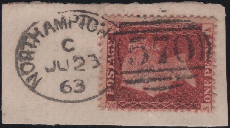 1863 SMALL PIECE 1D (SG40) 'NORTHAMPTON/570' SPOON 1ST RE-CUT (RA107). Small piece fine used D2 1d rose-red on white paper (SG40) lettered SA tied fine strike 'NORTHAMPTON/570' spoon 1st re-cut (RA107) JU 23 63 code 'C'. (Ref 141167).