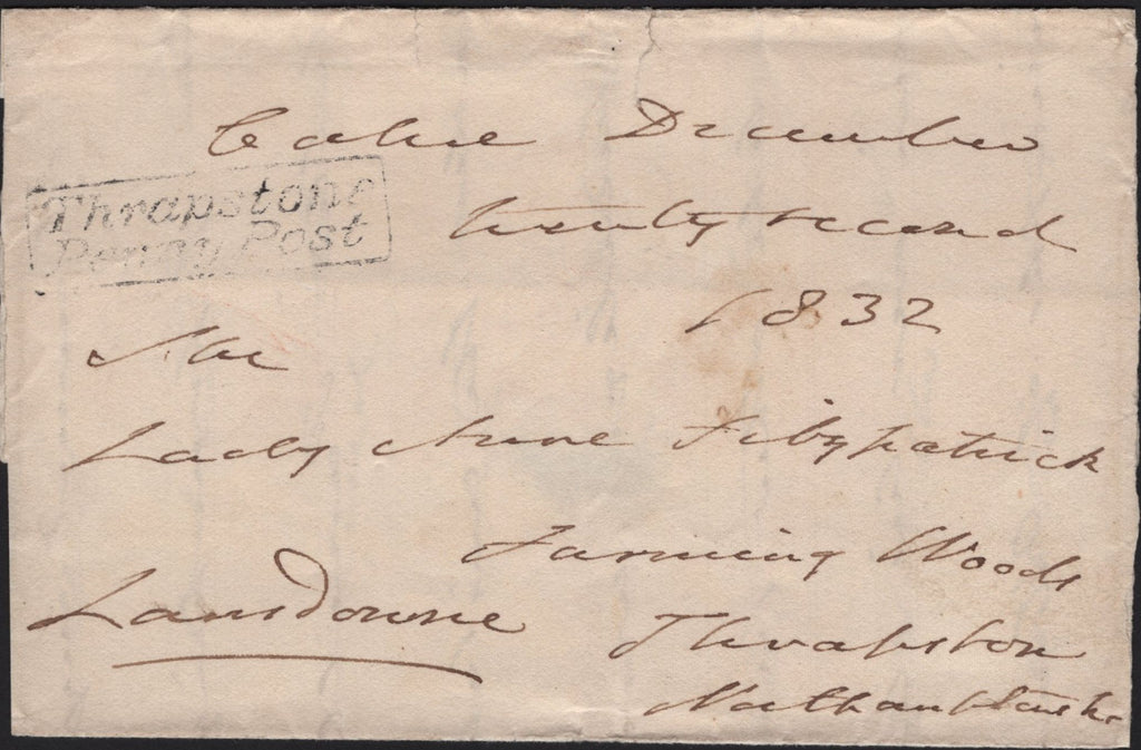 1832 MAIL CALNE, WILTS TO THRAPSTON, NORTHANTS WITH 'CALNE' HAND STAMP (W117) AND 'Thrapston/Penny Post' HAND STAMP (NN221). Large part wrapper sent free mail from Calne to 'Lady Anne Fitzpatrick, Farming Woods, Thrapston, Northamptonshire' dated December 22nd 1832 and on reverse good strike 'CALNE' straight line hand stamp in black (W117). On front good to fine strike 'Thrapston/Penny Post' hand stamp in black (NN221). (Ref 141703).