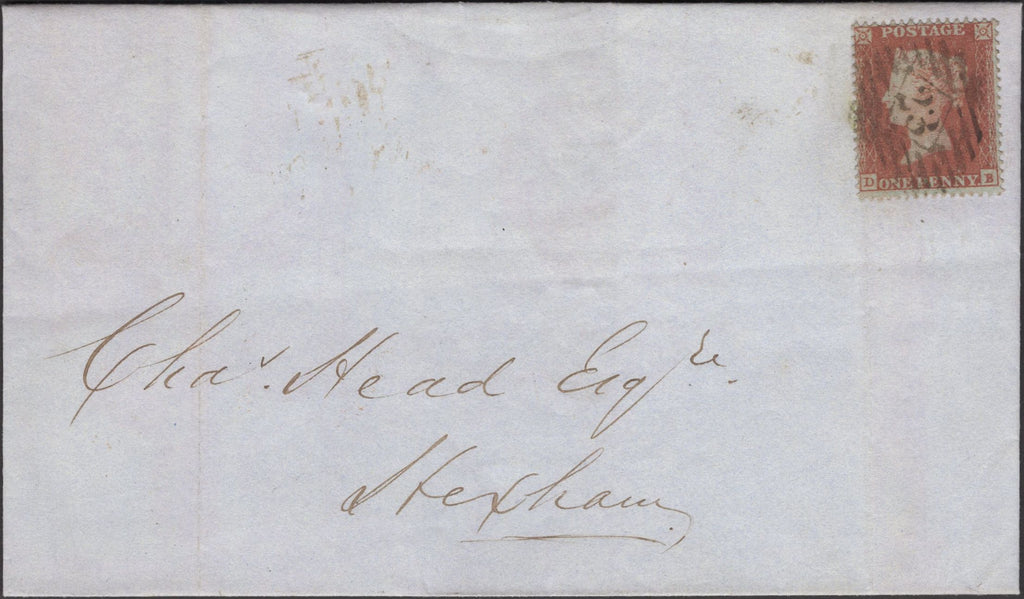1853 1D ARCHER EXPERIMENTAL PERFORATION PL.97 (SG16b)(DB) ON WRAPPER LONDON TO HEXHAM. Wrapper London to 'Chas. Head Esqre, Hexham' with good used 1d Archer experimental perforation pl.97 (SG16b) lettered DB tied fine strike London '23' Inland Office numeral. Filing fold just affects stamp at left. On reverse London date stamp AU 8 1853. A good used Archer on cover before the introduction of official perforation in February 1854. (Ref 135047).