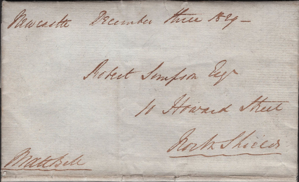 1829 FREE FRANK WOOLSINGTON TO NORTH SHIELDS. Fine letter from Woolsington dated 3 Dec 1829 to 'Robert Simpson Esq, 10 Howard Street, North Shields' dated at top and signed 'Matt Bell' at lower left. On reverse Newcastle date stamp DE 3 1829. Fine example of a free frank, Matt Bell was a member of Parliament. (Ref 140266).