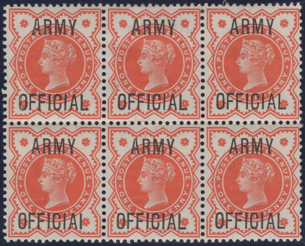 1896 ½D VERMILION 'ARMY OFFICIAL' (SG041) MINT BLOCK OF SIX, ONE STAMP 'OFFICIAI' FOR 'OFFICIAL' (SPEC L36c). A good to fine mint block of six 1896 ½d vermilion 'ARMY OFFICIAL' (SG041), stamp at lower left with excellent variety 'OFFICIAI' for 'OFFICIAL' (Spec L36c). Vertical crease affects centre two stamps but block with fine original gum, four stamps unmounted and the variety fine unmounted o.g. (Ref 135136).