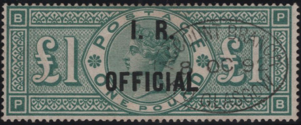 1892 £1 GREEN 'I.R. OFFICIAL' (SGO16) GOOD TO FINE USED. Good to fine used 1892 £1 green overprinted 'I.R. OFFICIAL' (SGO16) lettered PB, slight toning on reverse only, cancelled neat strike 'ACCOUNT BRANCH/GLASGOW' oval date stamp 8 OC 92. (Ref 141036).