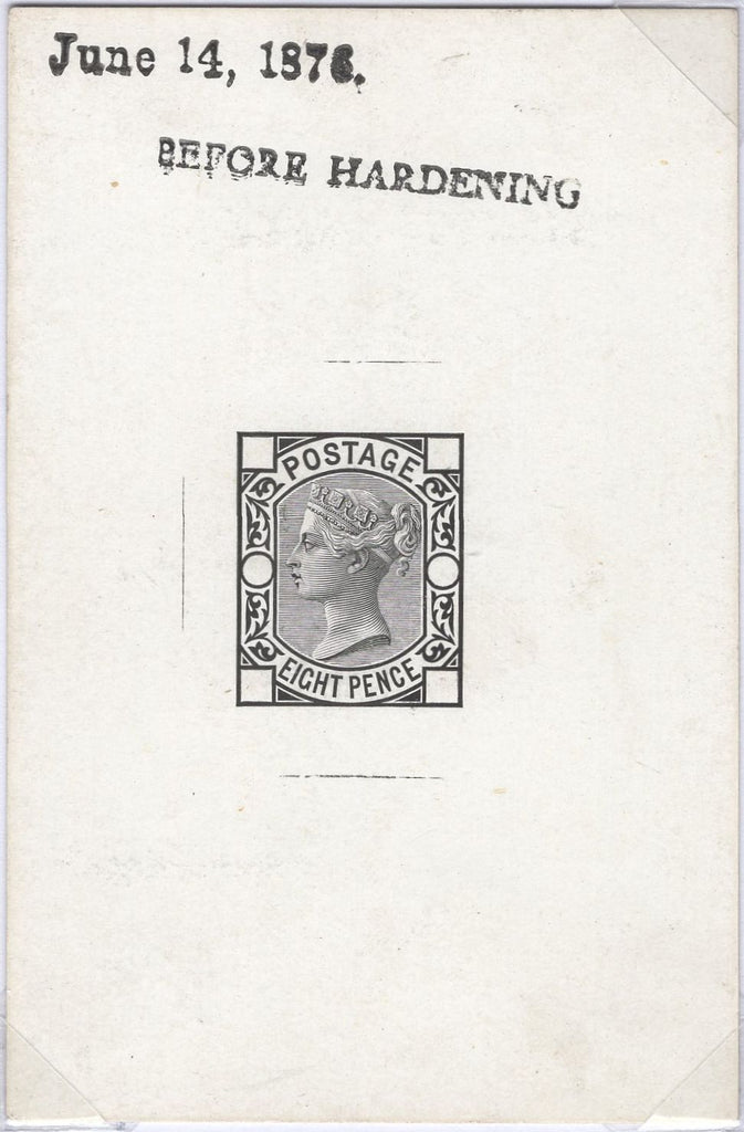 1876 8D DIE PROOF (SG156) DATED JUNE 14, 1876. A superb die proof in black on white glazed card 8d value (SG156), 61 x 92, with date stamp 'June 14, 1876.' and 'BEFORE HARDENING' hand stamp. Very scarce. (Ref 135070).