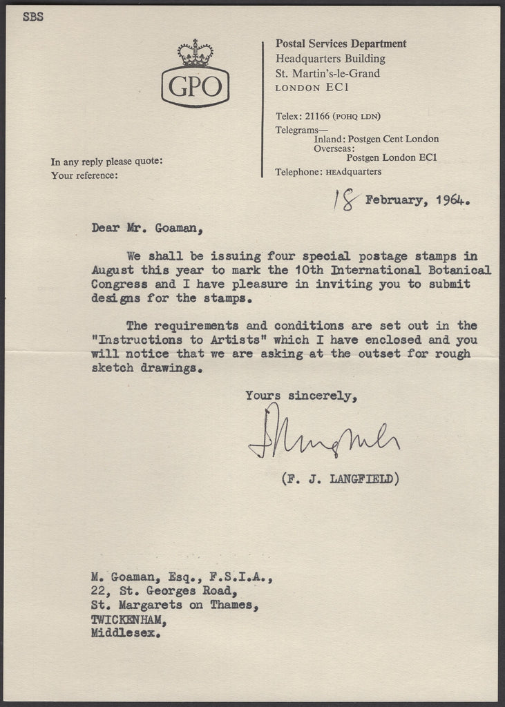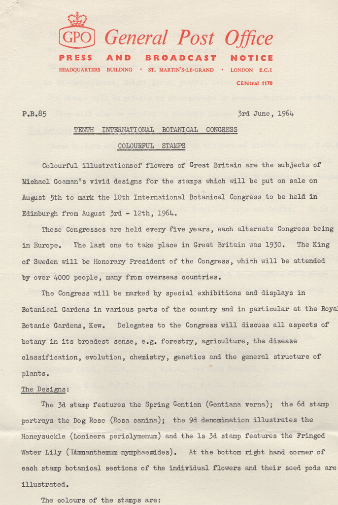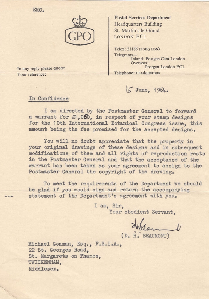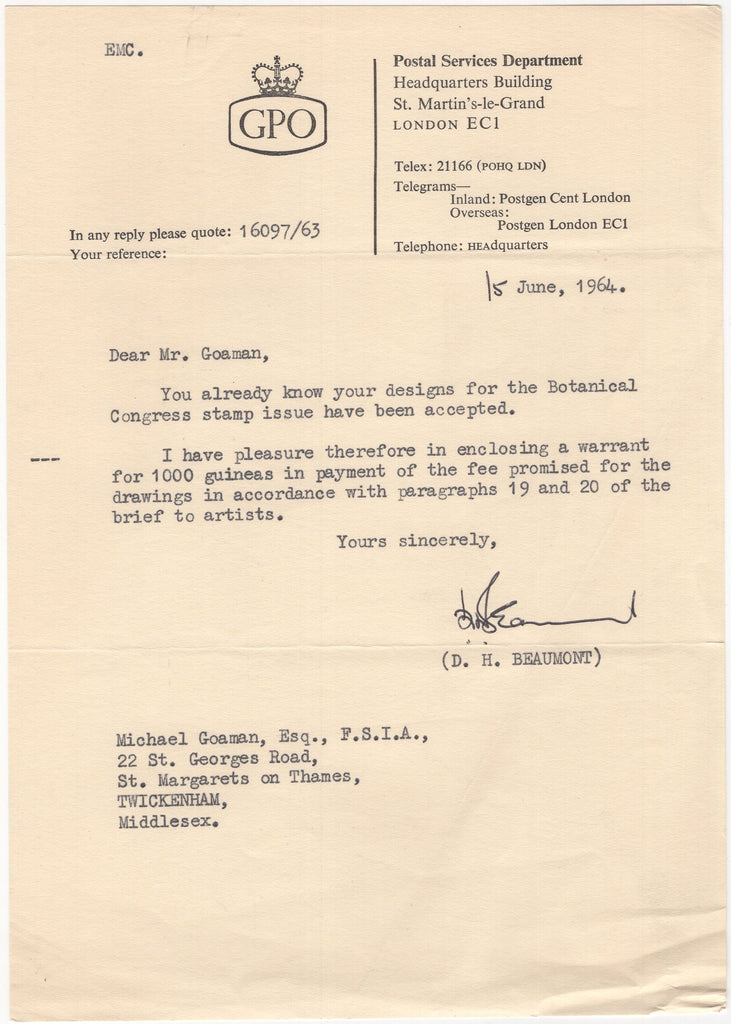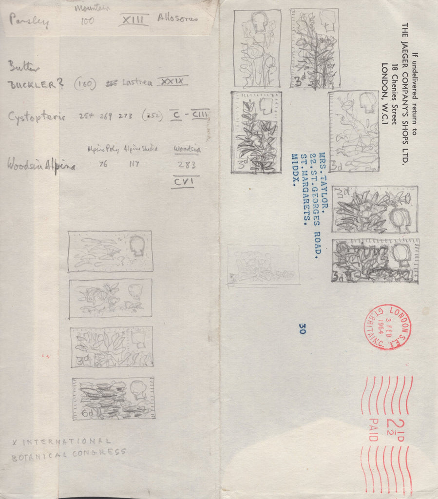 1964 'TENTH INTERNATIONAL BOTANICAL CONGRESS' SUPERB ARCHIVE OF ARTWORK BY THE DESIGNERS OF THIS ISSUE MICHAEL AND SYLVIA GOAMAN. A remarkable group of artwork produced by the stamp designers Michael and Sylvia Goaman for the 1964 Botanical Congress issue (SG655-658), the Goamans were the designers of the accepted designs. This collection is contained in two very full albums and includes letters from the Post Office inviting their submissions, a superb group of pencil sketches on tracing paper many close to the issue designs but also un-adopted suggestions, also enclosed are 16 beautiful larger hand painted essays of suggested designs. A fabulous group. Individual retail approximately £30,000. As a collection £18,500. (Ref 135246).