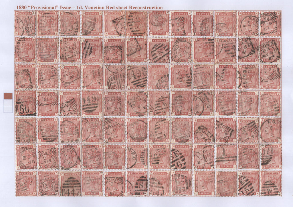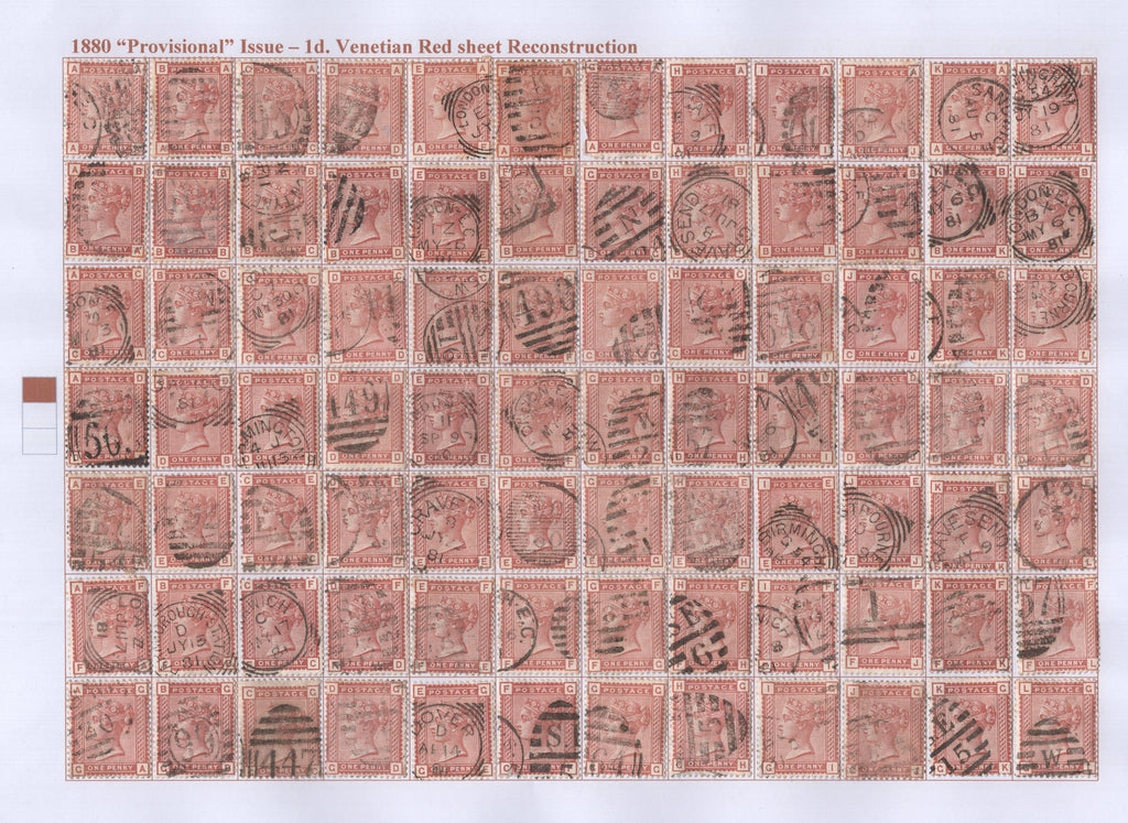 COLLECTION 1881 1D VENETIAN RED (SG166) INCLUDING 12 IMPRIMATURS, 'SPECIMEN' OVERPRINTS, DIE PROOF AND PLATE RECONSTRUCTION. A very fine collection of the 1880 1d venetian red (SG166) including 12 imprimaturs lettered AA, AB, AD, AE, AF, AH, AI, AJ, AK, BG, BI and AF, 17 examples overprinted 'SPECIMEN' type 9 including 2 blocks of four all different letterings, a superb Die Proof 'Sep 1 1879' 'BEFORE HARDENING'. Also an attractive complete sheet reconstuction and a second reconstruction less five letterings. A very fine lot, individual retail circa £3000, available as a collection only £2500. (Ref 141345).