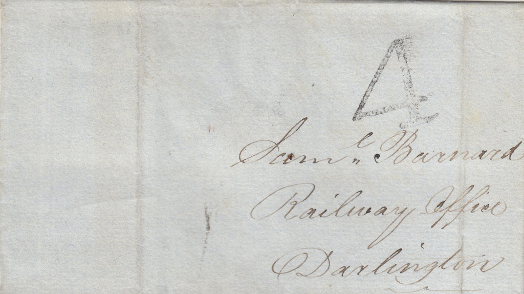 1840 MAIL CARLISLE TO DARLINGTON DATED JAN 3 1840 WITH UNIFORM FOURPENNY POST HANDSTAMP '4' OF CARLISLE. Fine wrapper from Carlisle to 'Saml. Barnard, Railway Office, Darlington', on front fine strike handstamp '4' of Carlisle and on reverse light strike 'CARLISLE' date stamp JA 3 1840. Light filing folds well clear of handstamp. Within receiver's note JAN 4 1840. Rare. (Ref 141544).