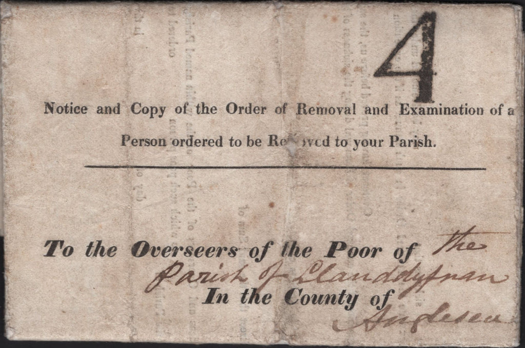 1841 PRINTED 'OVERSEERS OF THE POOR OF THE PARISH ... IN THE COUNTY OF ANGLESEY....' PRINTED DOCUMENT BANGOR TO ANGLESEA WITH BANGOR UNIFORM FOURPENNY POST '4' HAND STAMP USED AS A CHARGEMARK (W232). Good four page printed document from Bangor 'To the Overseers of the Poor of the Parish of Llanddyfnan, In the County of Anglesea' dated 12th February 1841. On front very fine strike of the Bangor Uniform Fourpenny Post '4' handstamp in black and used as a chargemark. On reverse 'BANGOR' date stamp FE 19 1841. Some soiling but a very rare Welsh Fourpenny Post handstamp, this apparently the only recorded example as a chargemark. (Ref 141956).