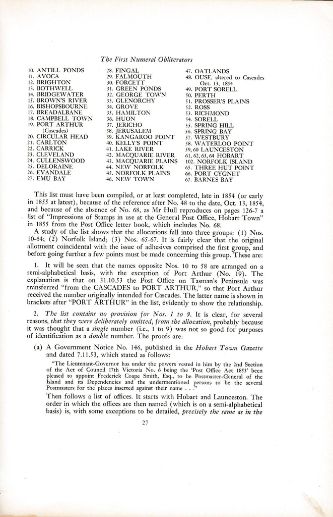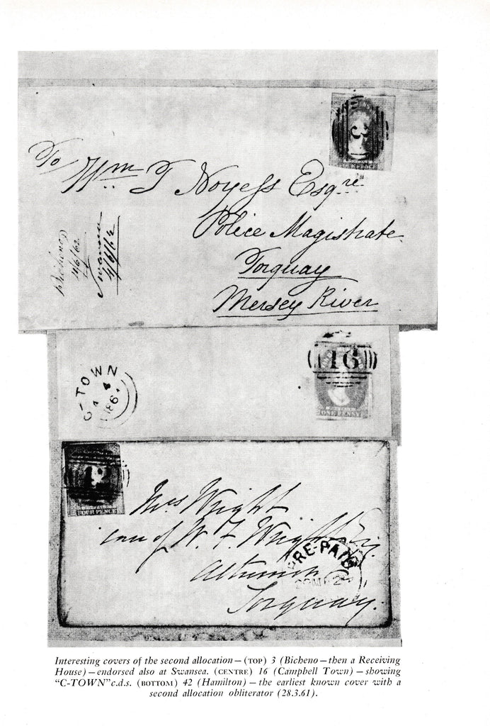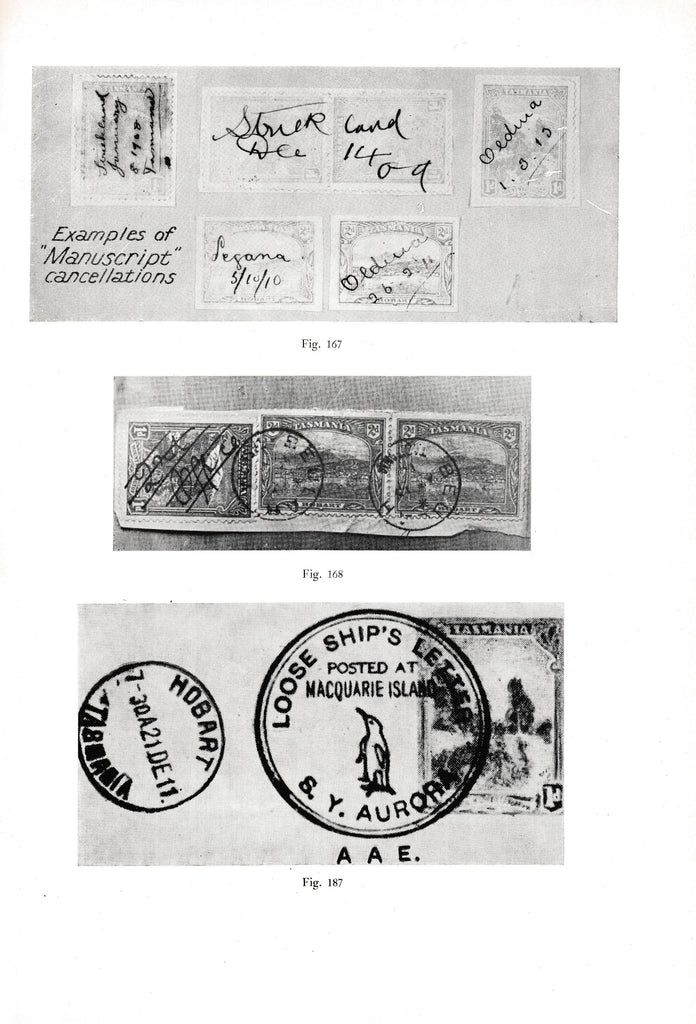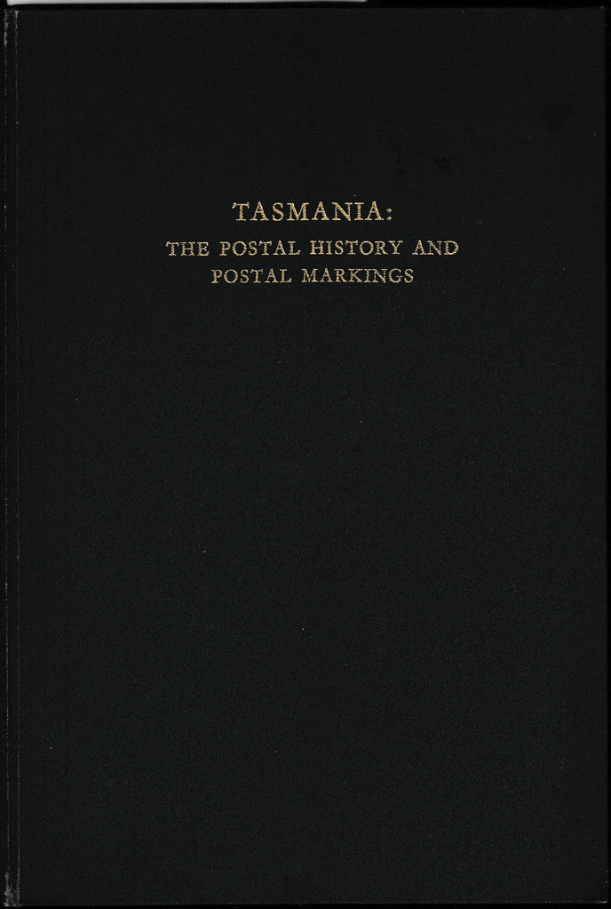 'TASMANIA: THE POSTAL HISTORY AND POSTAL MARKINGS' BY CAMPBELL, PURVES AND VINEY. A fine copy of this superb hardback published in 1962 by The Royal Philatelic Society of Victoria, 203 pages. Small stain at foot but excellent content The Historical Background; Pre-adhesive and other early postal markings; The First Numeral Obliterators; Post Offices and receiving houses opened 1854-61; The second allocation of Numeral Obliterators; The Cancellations of Hobart, Launceston and Zeehan 1861-1912; The Post Offices in Operation 1900-12 and their circular date stamps etc etc. (Ref 127002).