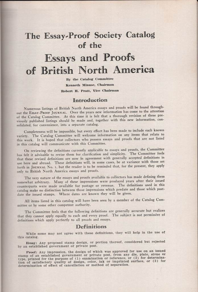 'THE ESSAYS AND PROOFS OF BRITISH NORTH AMERICA' COMPILED BY MINUSE AND PRATT. Fine copy 1970 hardback, 198 pages, book attempts to bring together all information known on these essays and proofs with fine illustrations on glossy paper. Very fine reference. (Ref 140429).