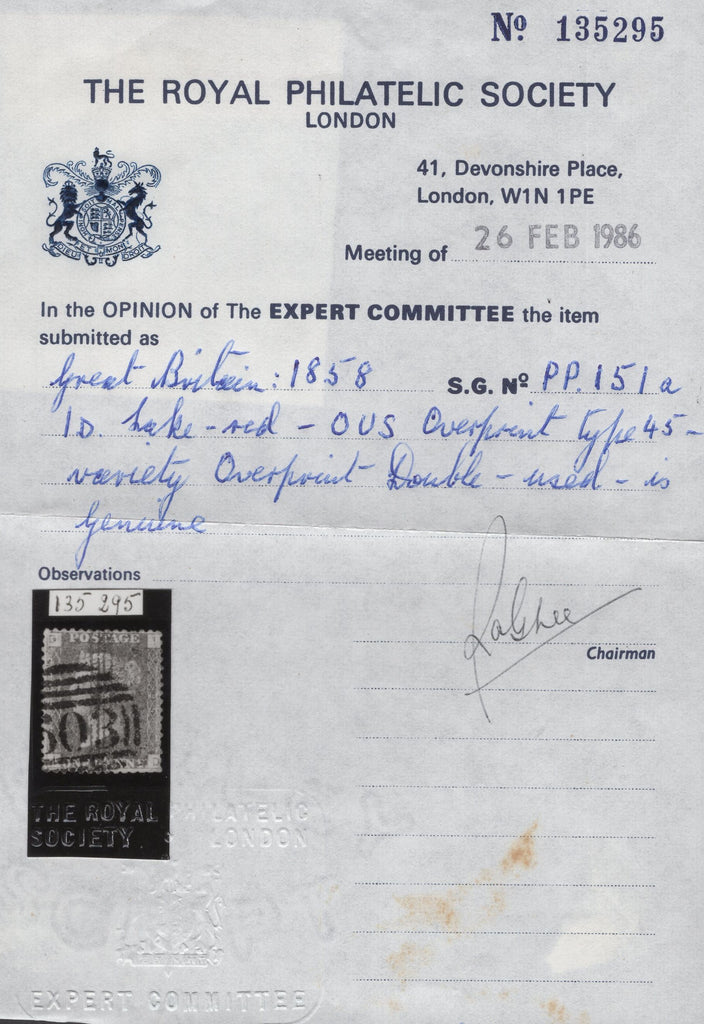 1858 1D PL.95 (SG43) 'O.U.S' OVERPRINT READING UPWARDS VARIETY OVERPRINT DOUBLED (SPEC PP223a), GOOD TO FINE USED. Good to fine used 1858 1d pl.95 (SG43) lettered ID, several shorter perforations at lower right and cancelled '603' numeral of Oxford, stamp clearly showing the very rare variety 'O.U.S' overprint reading upwards VARIETY DOUBLE (Spec PP223a). Very few examples exist. RPS cert 135295. (Ref 138351).