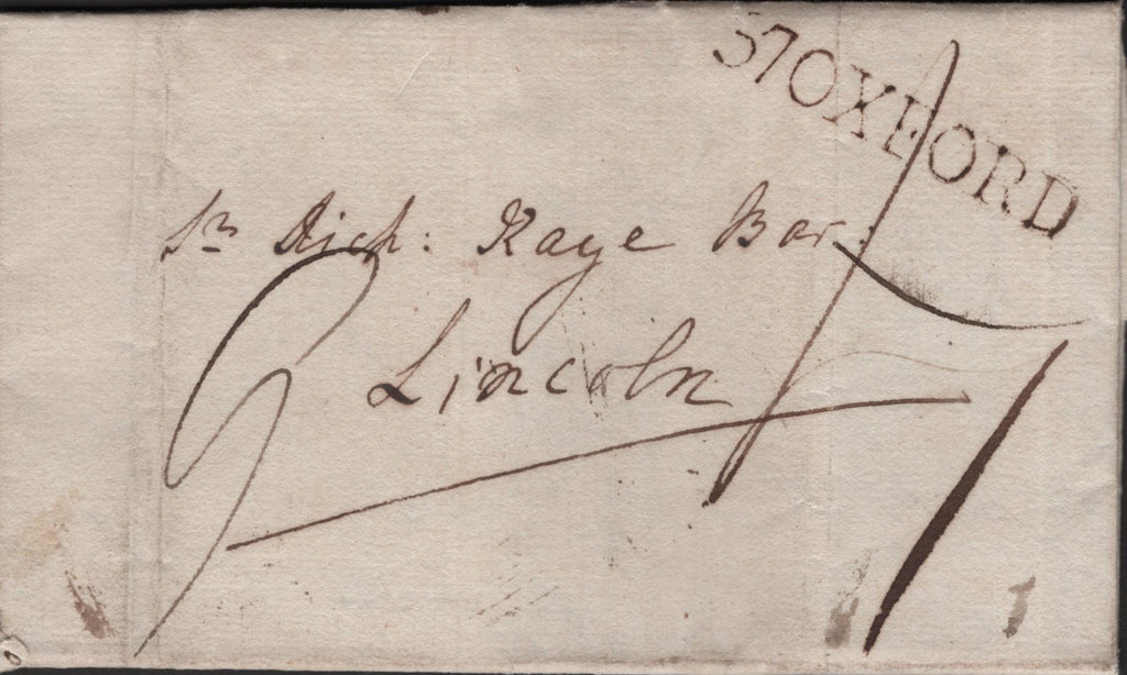 1790 MAIL OXFORD TO LINCOLN WITH '57 OXFORD' FIRST TYPE MILEAGE MARK (OX167). Letter from Oxford dated Nov 1 1790 to Lincoln, charged '9', '8' double rate and 1d local charge (?), on front very fine strike '57 OXFORD' first type mileage mark in black (OX167). (Ref 140967).