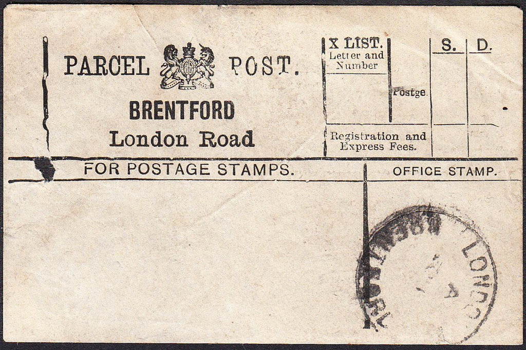 PARCEL POST LABEL/MIDDX. Undated label BRENTFORD London Road (some faults) cancelled LONDON RD/BRENTFORD cds. (Ref 91296).