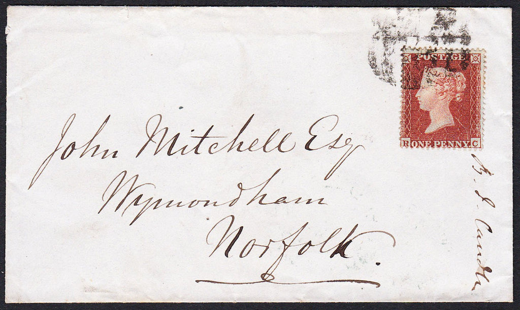 PL.196 (RC)(SG17) ON COVER. 1855 envelope Wakefield to Wymondham with fine Die I 1d pl.196 S.C.16 (SG17) lettered RC, a little off centre but fine colour, tied '831' numeral of Wakefield. On reverse WAKEFIELD date stamp JA 15 1855. (Ref 89068).