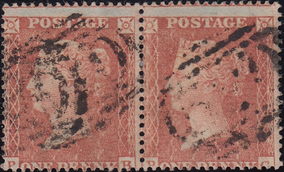 1855 PL.10 (SG21) HORIZONTAL PAIR (PB PC). Used horizontal pair 1855 die 2 1d pl.10 S.C.16 (SG21) lettered PB PC, centred low, PALE RED SHADE. (Ref 120664).