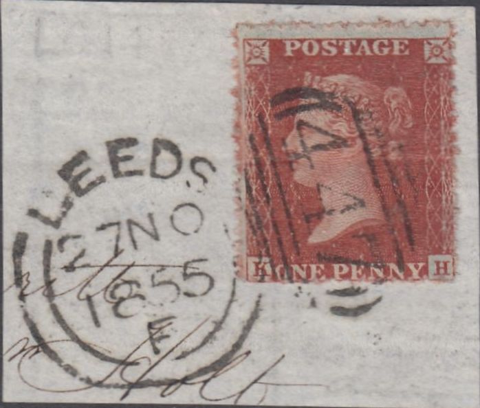 PL.15 (KH)(SPEC C6). Small piece with good used 1855 die 2 1d pl.15 L.C.14 (spec C6) lettered KH, tied neat LEEDS/447 sideways duplex 27 NO 1855 code F. Horizontal crease. (Ref 113733).