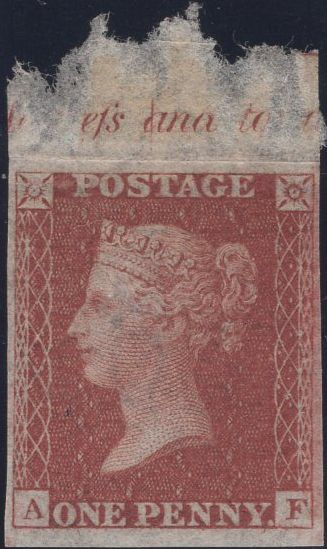 1855 DIE 2 1D PL.20 IMPERFORATE IMPRIMATUR LETTERED AF. A very fine imperforate imprimatur from 1855 die 2 1d pl.20 lettered AF with four very fine margins and part top margin with marginal inscription. Fine colour. (Ref 135033).