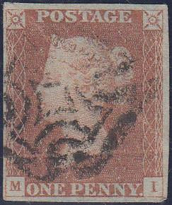 1841 1d imperf pl.13 lettered MI (SG8). A used example lettered MI horizontal crease 4 margins cancelled black MC fine used cats £170.00.  (Ref 67439).