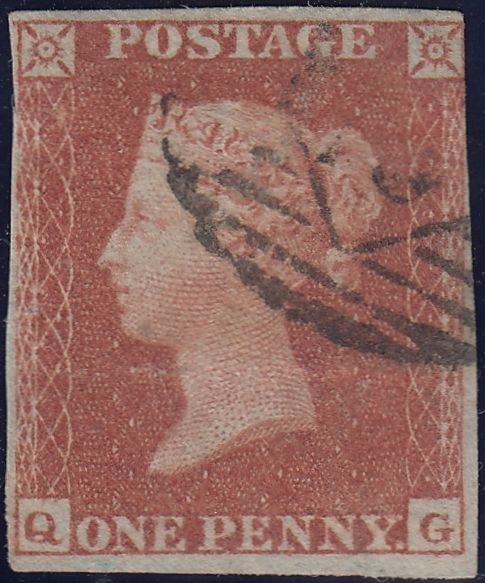 1852-1854 1D PL.157 MATCHED PAIR 1D IMPERF (SG8) AND 1D PERF (SG17) LETTERED QG. Good used 1852 1d pl.157 (SG8) lettered QG, very close at upper right otherwise four margins, horizontal bend with London cancellation. Matched with 1854 1d S.C.16 (SG17) lettered QG, fault centre of stamp but fine perforations with Scots local cancellation. (Ref 119113).