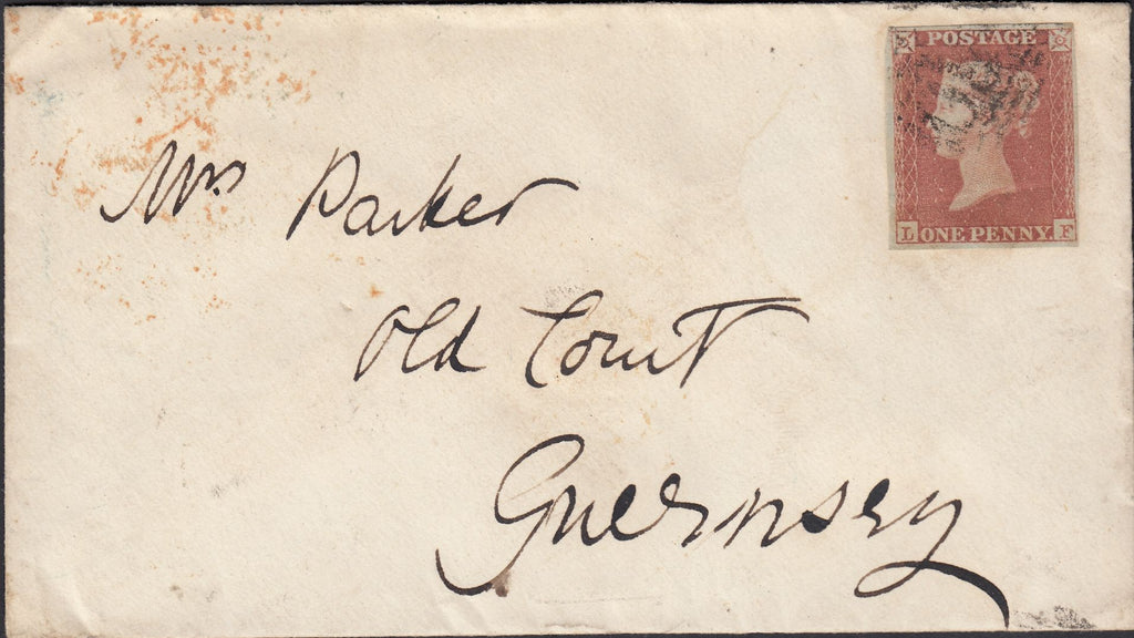 1854 MAIL TO GUERNSEY WITH 1D PL.169 (SG8)(LF). Envelope to 'Mrs Parker, Old Court, Guernsey' with good 1d pl.169 (SG8) lettered LF with four close to fine margins and tied indistinct numeral. Scissor cut into NW square. On reverse 'GUERNSEY' date stamp in yellow. (Ref 131234).