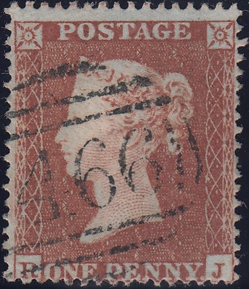 PL.190 (SG17)(RJ). Good used 1854 1d pl.190 S.C.16 (SG17) lettered RJ, corner bend but fine colour and fine perforations, cancelled '466' numeral of Liverpool. (Ref 121096).