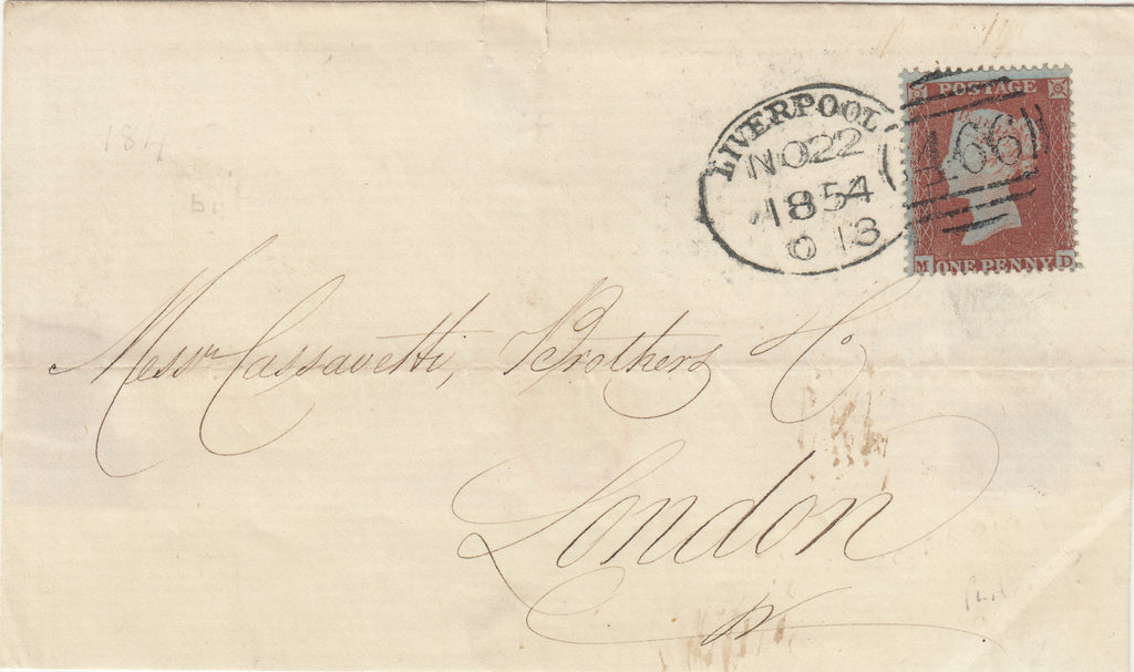 1854 PART WRAPPER LIVERPOOL TO LONDON 1D PL.184 (SG17)(MD CONSTANT VARIETY). Large piece Liverpool to London with fine Die 1 1d pl.184 S.C.16 (SG17), fine perforations tied fine strike 'LIVERPOOL/466' spoon type A13 (RA49) NO 22 1854 code 'O'. Stamp shows UNLISTED BUT CONSTANT VARIETY (PRESENT ON IMPRIMATUR SHEET) 'MARK IN 'D' SQUARE'. (Ref 141499).