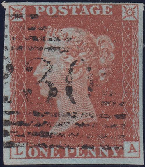 PL.39 (SG8)(LA). Good to fine used 1843 1d pl.39 (SG8) lettered LA with four close to large margins, cancelled '-30' numeral. (Ref 120389).