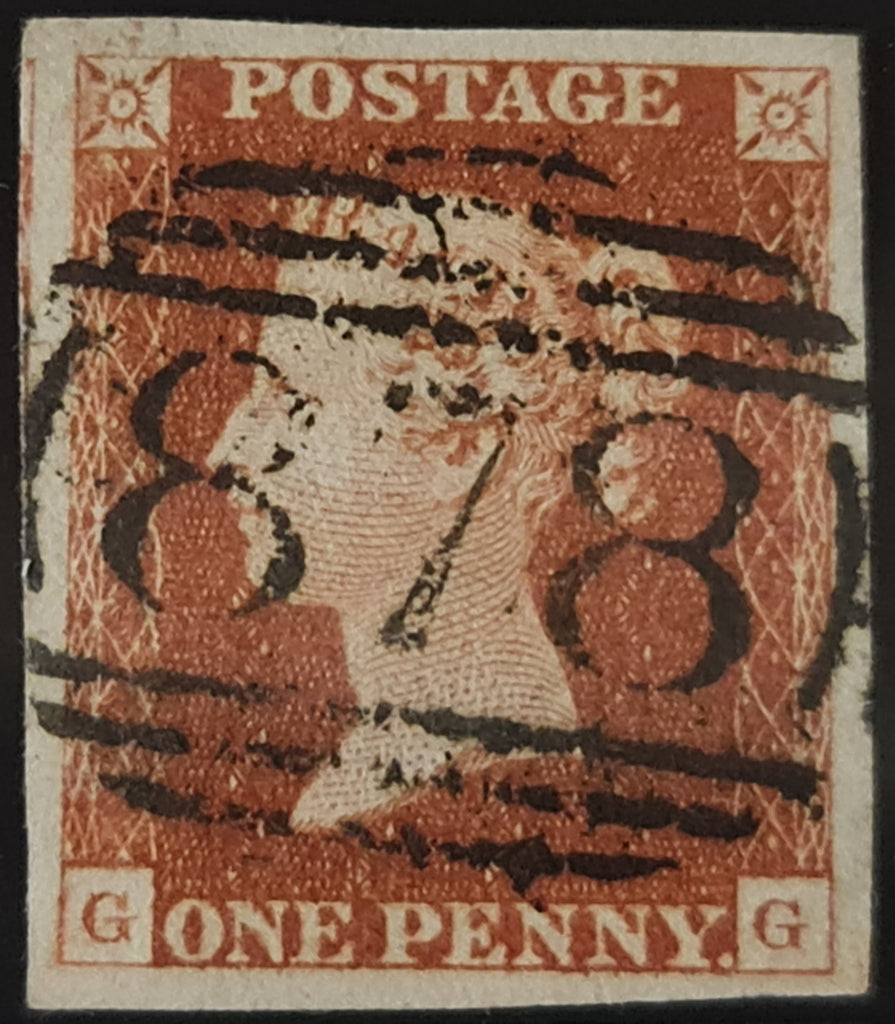 1844 1D PL.42 (SG8)(GG) MISSING IMPRIMATUR LETTERING VERY FINE USED. Very fine used 1844 1d pl.42 (SG8) lettered GG, four very fine margins with fine strike '878' numeral cancellation of Wigan (Lancashire). MISSING IMPRIMATUR LETTERING. (Ref 150362).