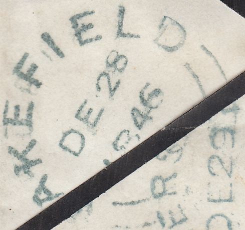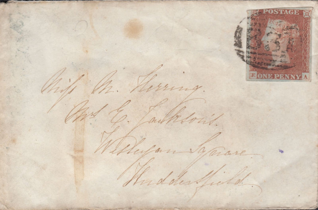 1845 YORKS/'ACKWORTH' UDC/PL.70 (SG8)(EA)  Envelope, slight soiling Wakefield to Huddersfield with 1d (SG8) pl.70 lettered EA, touched at upper left but tied '831' numeral of Wakefield. On reverse light strike 'ACKWORTH' udc in black and WAKEFIELD lower date stamp DE 28 1846. (Ref 114026).
