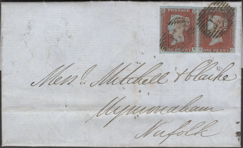 1846 MAIL LONDON TO WYMONDHAM WITH FINE PAIR 1D PL.62 (SG8)(OB OC). Fine letter from Lincoln's Inn Fields to 'Messrs Mitchell and Clark, Wymondham, Norfolk' with fine horizontal pair 1d pl.62 (SG8) lettered OB OC, fine four margins tied London '17' Inland Office numerals. On reverse London date stamp MR 3 1846. (Ref 135186).