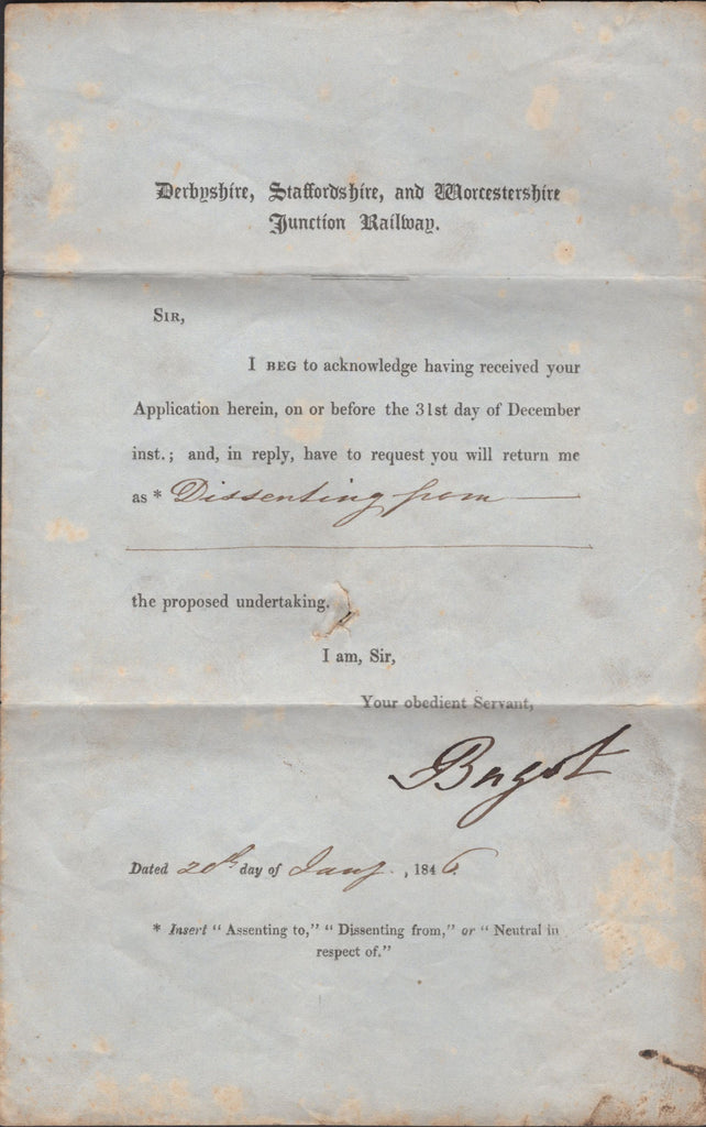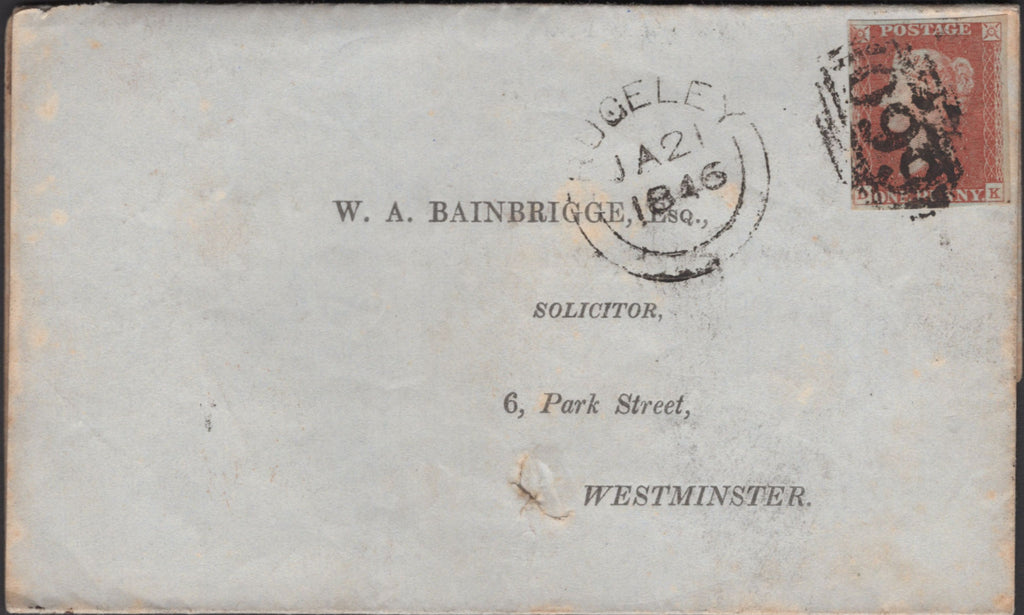 1846 MAIL RUGELEY, STAFFS TO LONDON WITH 1D PL.61 (SG8)(DK). Printed wrapper from the 'Derbyshire, Staffordshire, and Worcestershire Junction Railway' to a solicitor in Westminster with good used 1d pl.61 (SG8) lettered DK with four margins and tied good strike '660' numeral of Rugeley. Alongside 'RUGELEY' date stamp JA 21 1846. Stamp shows fine Blur NW square. (Ref 135277).