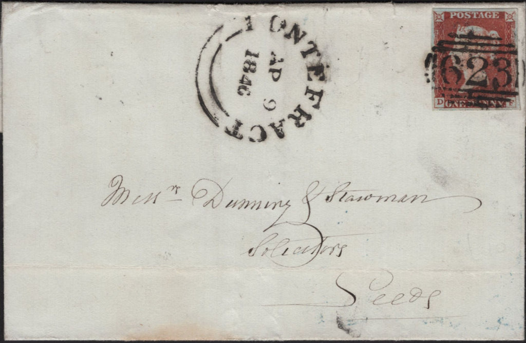 1846 MAIL PONTEFRACT, YORKS TO LEEDS 1D PL.58 (SG8)(DF). Wrapper from Pontefract to Solicitors in Leeds with fine 1d pl.58 (SG8) lettered DF, fine four margins tied fine strike '623' numeral of Pontefract. Alongside 'PONTEFRACT' date stamp AP 9 1846. (Ref 141911).