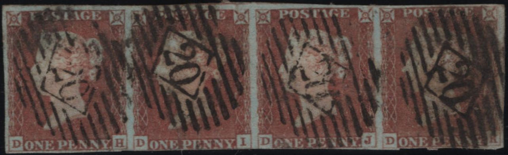 1846 1D PL.71 (SG8) GOOD USED STRIP OF FOUR. Good used horizontal strip of four 1846 1d pl.71 (SG8) lettered DH DI DJ DK, all touched in places but good appearance and cancelled fine strikes London '20' Inland Office numerals. (Ref 142257).