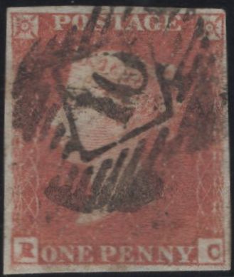 1848 1D PL.87 (SG8)(RC CONSTANT VARIETY 'P' CONVERTED TO 'R')(SPEC BS76d). Good used 1848 1d pl.87 (SG8) lettered RC with four fine margins, light bend, London '10' Inland Office cancellation clear of the excellent constant variety 'P CONVERTED TO R' (Spec BS76d). (Ref 135132).