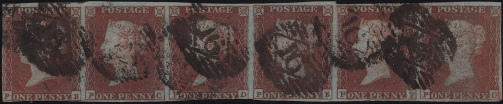 1849 1D PL.96 (SG8) HORIZONTAL USED STRIP OF SIX. Used horizontal strip of six 1849 1d pl.96 (SG8) lettered PB PC PD PE PF PG, PB and PD cut into otherwise four margins, slight creasing on reverse affects PB and PG. Stamps cancelled heavier strikes London '16' Inland Office numerals. (Ref 138770).