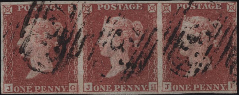 1849 1D PL.96 (SG8) HORIZONTAL STRIP OF THREE JG JH JI, GOOD USED. Good used horizontal strip of three 1849 1d pl.96 (SG8) lettered JG JH JI, JI touched at lower right otherwise fine margins. (Ref 138856).