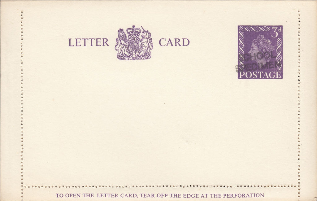 1960 3D VIOLET LETTER CARD/POST OFFICE TRAINING. Fine unused 1960 3d violet Letter Card overprinted 'SCHOOL/SPECIMEN' in black as used at Post Office Training Schools. (Ref 118539).