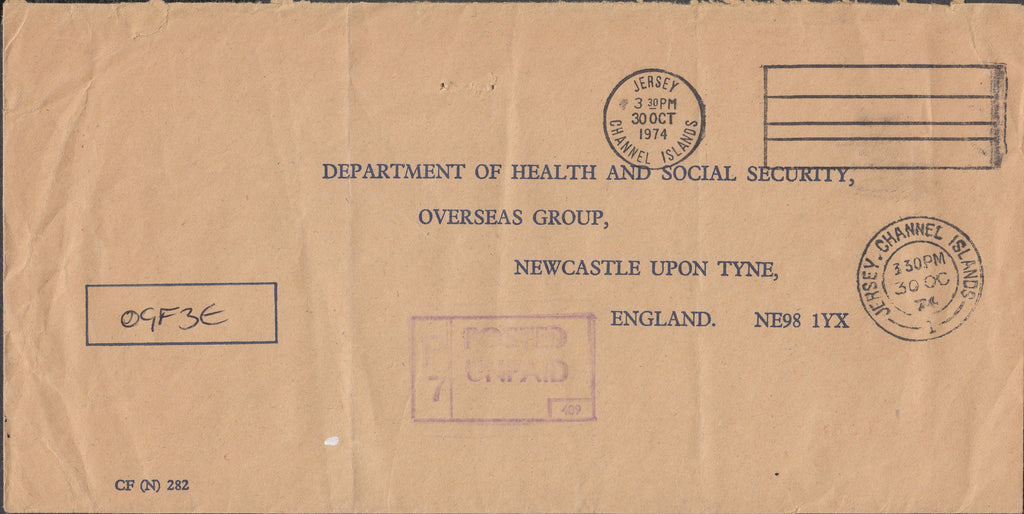 1974 UNPAID MAIL JERSEY TO NEWCASTLE UPON TYNE. Envelope (221 x 110) Jersey to Newcastle on Tyne, postage unpaid and cancelled JERSEY/CHANNEL ISLANDS 30 OCT 1974 with "7P/POSTED UNPAID/409" Jersey charge mark. (Ref 102717).