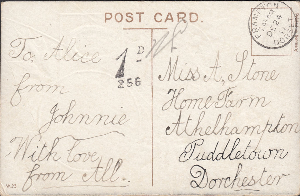 1911 UNPAID MAIL FRAMPTON (DORSET) TO PUDDLETOWN. Fine post card Frampton to Puddletown Dorchester, posted unpaid, cancelled neat FRAMPTON/DORSET date stamp DE 24 11 and with fine '1D/256' charge mark of Dorchester. Fine usage. (Ref 117127).